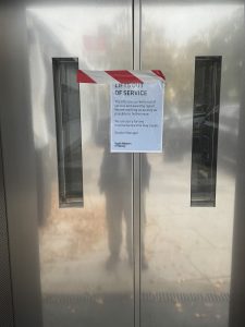 The sign says: “Lifts out of service. The lifts are currently out of service and awaiting repair. We are working as quickly as possible to fix the issue.  We are very sorry for any inconvenience this may cause. Station Manager. “