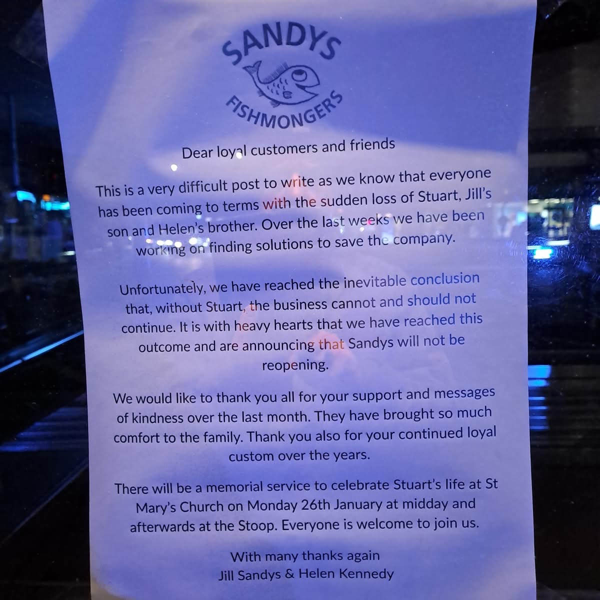 An emotional message to customers today from Stuart’s mother, Jill and sister Helen, said: