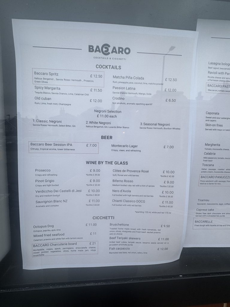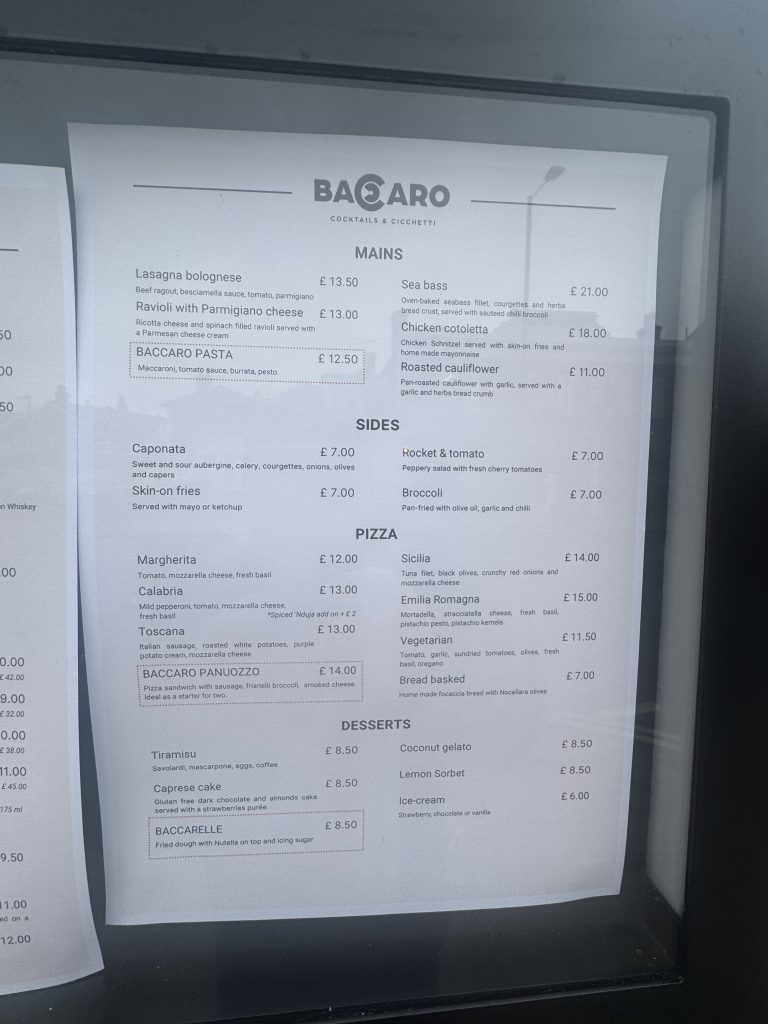 The menus were posted for the first time outside showing the prices of cocktails like Baccaro Spritz and Matcha Pina Calado, (£12.50) well as pasta dishes like lasagne and ravioli and pizzas such as Margarita (£12) and Emilia Romagna (£15)